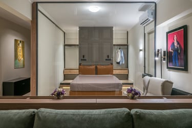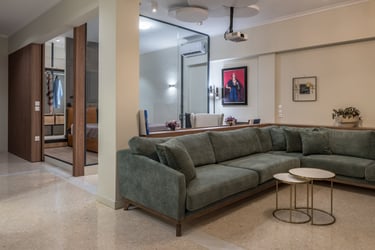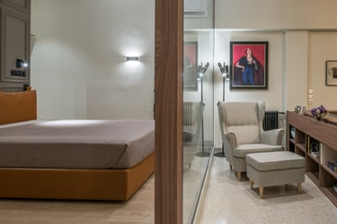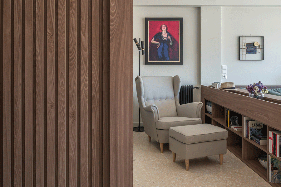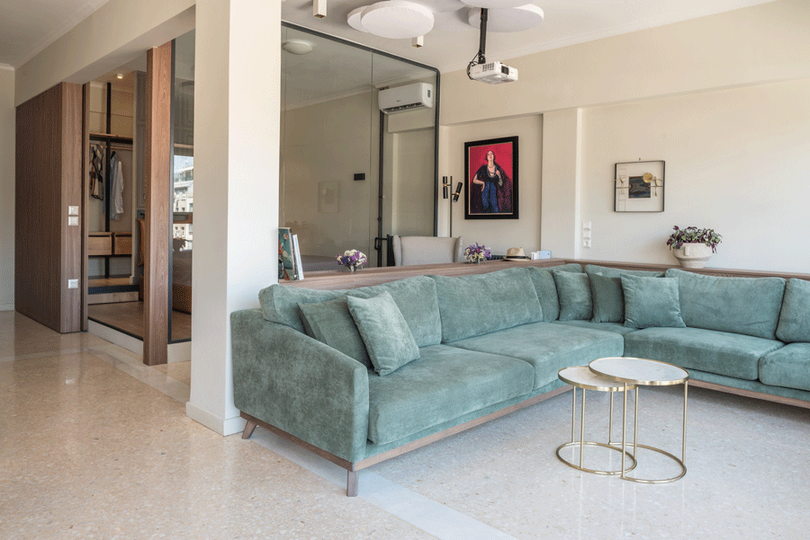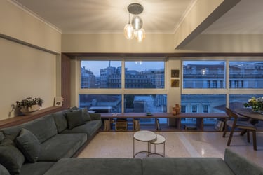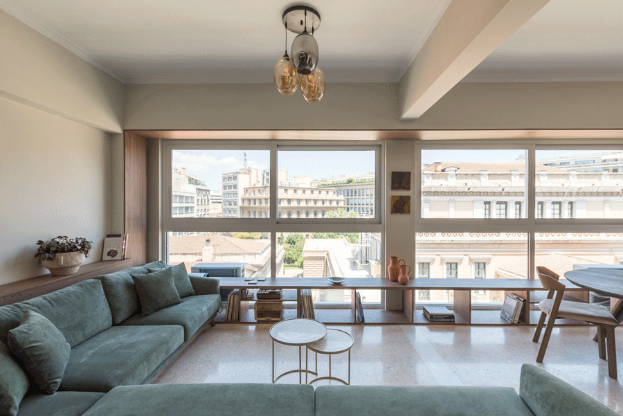 After a total construction renovation and change of land use from office to residence, the apartment is oriented into the panoramic view towards the old Parliament of Athens. Giving emphasis on optical sense, a wooden frame embraces the façade, the view and the light that intrudes the whole space.