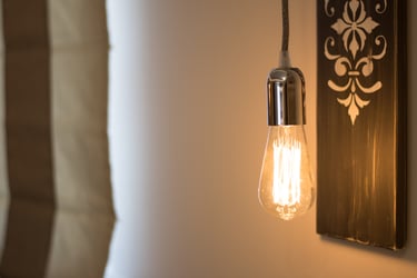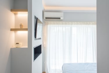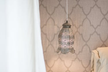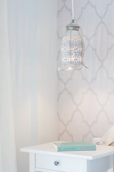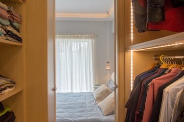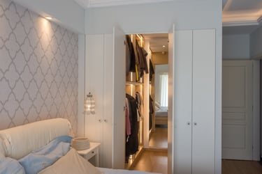 Master bedroom obtains a homy and cosy atmosphere in a Moroccan-like style, when the wooden floor is combined with bright fabrics and curtains, and light wallpaper patterns. A custom-designed walk-in closet is constructed to provide space-saving options, while the automatic lighting and large mirror increase functionality and dramatically enhances the aesthetic of a simple design. On the other hand, the master bathroom is designed to be more ambient through grey tiles, grey-stone handbasins, atmospheric lighting fixtures and transparency and reflections via glass and mirror.