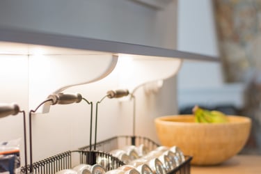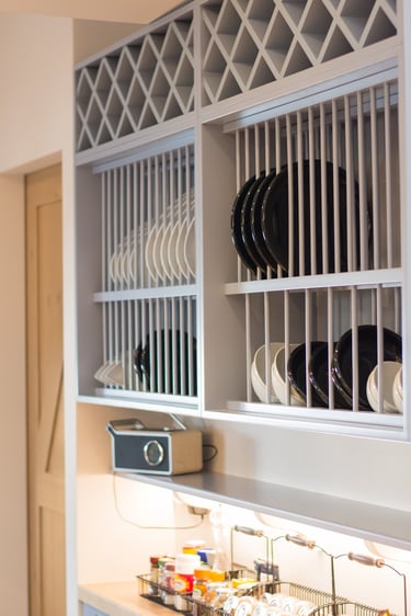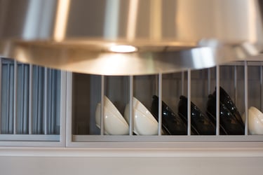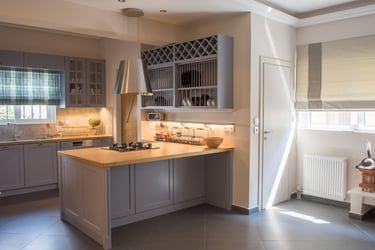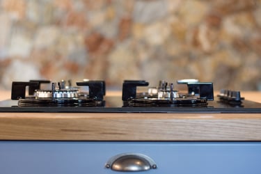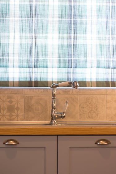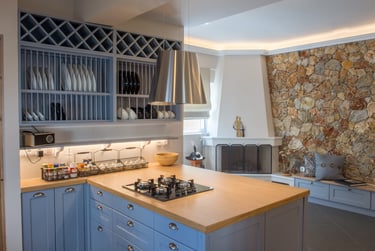 The general aesthetic represents rural farmhouse-like design and the feeling of simpler living. The color palette of the kitchen incorporate pastel and bright colors with the addition of checkered fabric curtains and design elements like vintage signage. The dominant materials include wood and rock along with other organic materials. The inclusion of a hearth, tall wood-burning fireplace, natural wood beams, brick, bright wood furniture material and smooth bright fabric colors emphasize more the expression of this aesthetic.