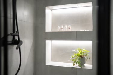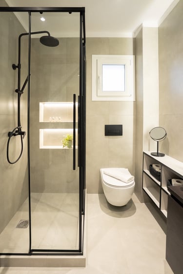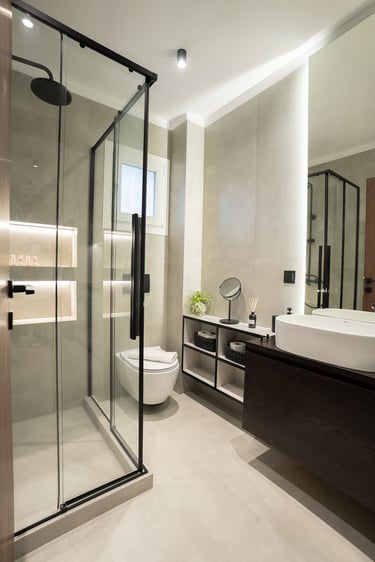 The compact bathroom recalls the quality of a hotel, featuring a transparent shower enclosure, a full-height mirror, and concealed architectural lighting that promote a sense of relaxation and well-being.