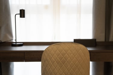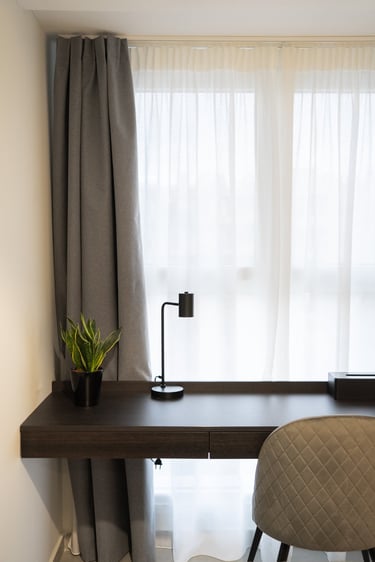 In the bedroom, the transparency of the wardrobe enhances visual depth, giving the impression of a larger space. An additional office area positioned in front of the window takes advantage of the park view, offering a calm working environment.
