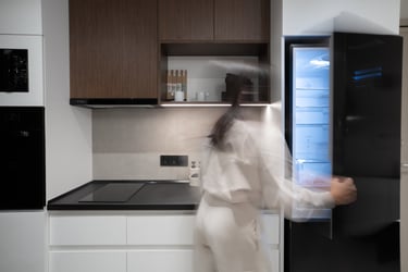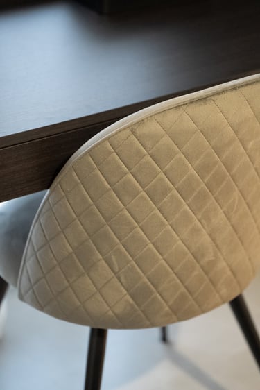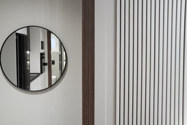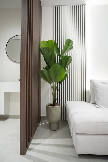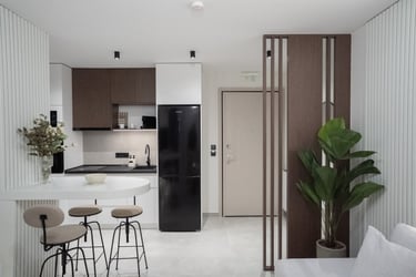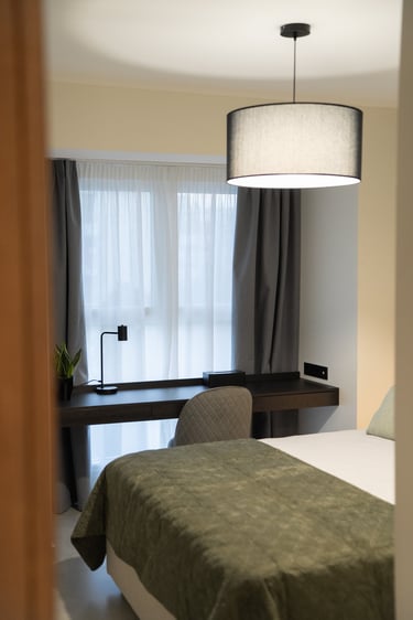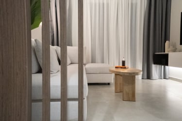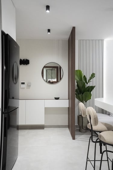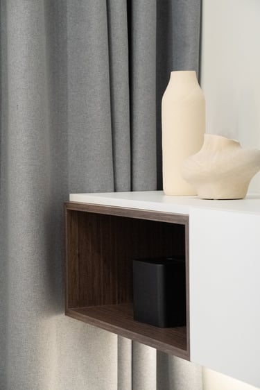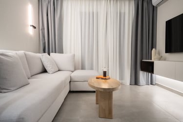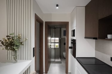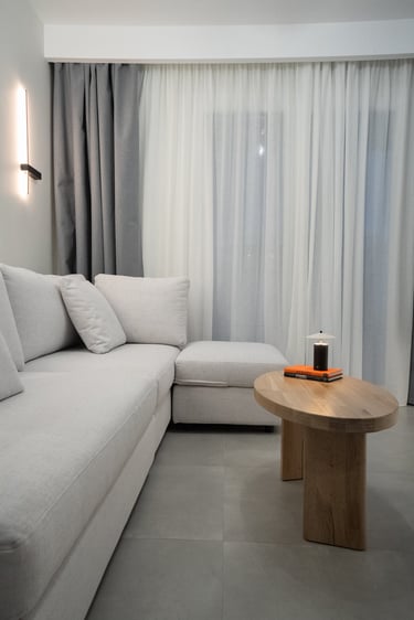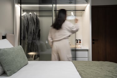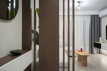 Nexa suite is defined by minimal lines and a clear spatial organization. The design combines bright tones with dark wood finishes, creating a refined and luxurious atmosphere. Comfort is introduced through a customized sofa and bespoke furniture, all designed by the architect to optimize storage while maintaining a sense of openness.