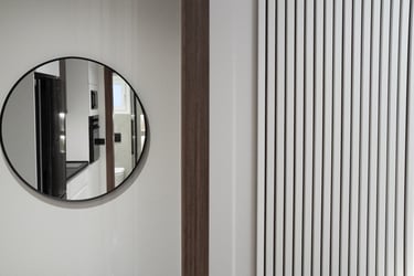 Nexa suite is defined by minimal lines and a clear spatial organization. The design combines bright tones with dark wood finishes, creating a refined and luxurious atmosphere. Comfort is introduced through a customized sofa and bespoke furniture, all designed by the architect to optimize storage while maintaining a sense of openness.